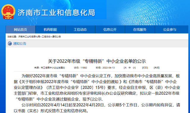 為做好2022年度市級(jí)“專精特新”中小企業(yè)認(rèn)定工作,加快推動(dòng)濟(jì)南市中小企業(yè)高質(zhì)量發(fā)展,根據(jù)《關(guān)于組織申報(bào)2022年度市級(jí)“專精特新”中小企業(yè)的通知 》和《濟(jì)南市“專精特新”中小企業(yè)認(rèn)定管理辦法》(濟(jì)工信中小企業(yè)字〔2020〕15號(hào))要求,經(jīng)企業(yè)自主申報(bào)、區(qū)(縣)中小企業(yè)主管部門初審、市工信局組織專家評(píng)審和局長(zhǎng)辦公會(huì)議研究確定,市工信局公示了2022“專精特新”中小企業(yè)認(rèn)定名單及復(fù)核企業(yè)名單。濟(jì)南恒譽(yù)環(huán)??萍脊煞萦邢薰卷樌ㄟ^(guò)復(fù)核。