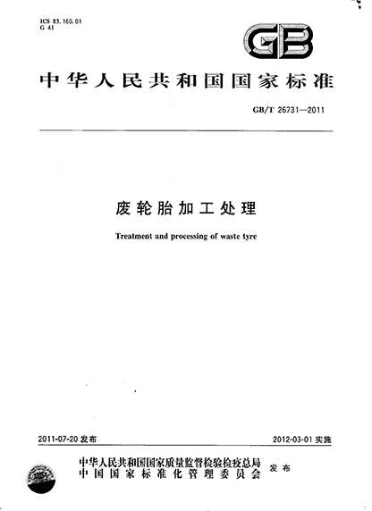 2012月3月,公司為主要起草單位的國家標(biāo)準(zhǔn)《廢輪胎加工處理》標(biāo)準(zhǔn)號:GB/T26731-2011,正式頒布實(shí)施